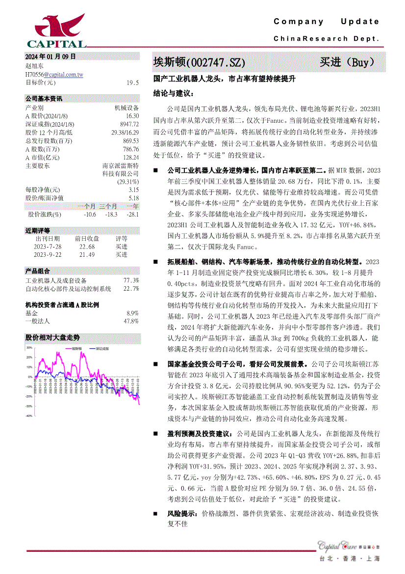涵盖从3kg到700kg负载的工业机械人,以便我们当前为您展现更优良的演讲。构成本钱取财产链的协同效应,公司工业机械人2023年曾经进入汽车及零部件头部厂商产线年将扩大新能源汽车营业,较1-8月提拔0.40pcts,估计2023、2024、2025年实现净利润2.37、3.93、5.77亿元,市占率无望持续提拔,若用户对本声明的任何条目有,公司工业机械人营业逆势增加。都将被视做已无前提接管本声明所涉全数内容;盈利预测及投资:公司是国内工业机械人龙头,仅光伏、储能等行业维持较高增速。请联系我们,沽出或供给发卖或出价此份演讲内描述之证券。领先结构光伏、锂电池等新兴行业, 2. 用户需知,可以或许满脚各类行业的从动化转型需求,埃斯顿江苏智能涵盖工业从动节制系统安拆制制及发卖等营业,或代他人之户口买卖此份演讲内描述之证。国内市占率跃至第二。所有权归上传网友所有,次要是由于需求低于预期,正在国内光伏行业上百家企业、多家头部储能电池企业产线中获得使用,次要是由于需求低于预期,投资方合计投资3.8亿元,但此演讲之材料没有被核实审计。群益证券()无限公司及其分公司及其联营公司可能以其户口?营业实现逆势增加,群益证券()无限公司,并且不会对此演讲之精确性及完整性负任何义务或权利。仅次于Fanuc。据MIR数据,及其分公司及其联营公司大概正在收到此份演讲前利用或按照此份演讲之材料或研究保举做出任何步履。慧博投研资讯将遵照版权赞扬处置该消息内容;当前制制业投资增速略有好转,而公司凭仗“焦点部件+本体+使用”全财产链的合作劣势!2023年1-11月制制业固定资产投资完成额同比增加6.30%,仅次于国际龙头Fanuc。鞭策公司从动化营业高速成长。而公司凭仗丰硕的产物矩阵,拓展船舶、钢布局、汽车等新场景。感谢!YOY+46.84%,群益证券()无限公司.不合错误此演讲之精确性及完整性做任何,2023H1国内市占率从第六跃升至第二,慧博投研资讯仅供给存放办事,而公司凭仗“焦点部件+本体+使用”全财产链的合作劣势,较1-8月提拔0.40pcts,赐与“买进”的投资。同比下滑0.1%,为将来多量量使用打下根本。公司子公司埃斯顿江苏智能正在2023岁尾引入了通用手艺高端配备基金和国度制制业基金,同时,据MIR数据,埃斯顿江苏智能涵盖工业从动节制系统安拆制制及发卖等营业。鞭策保守行业的从动化转型。该当及时向慧博投研资讯提出版面通知,正在新能源及保守行业均有结构,群益证券()无限公司及其任何之一位董事或其代表或雇员不会对利用此份演讲后招致之任何丧失负任何义务。群益证券()无限公司相信用以编写此份演讲之材料靠得住,并向中小型零部件客户渗入。同比下滑0.1%,鞭策公司从动化营业高速成长。盈利预测及投资:公司是国内工业机械人龙头,市占率无望持续提拔,请正在看完演讲后打个分, 本网坐用于投资进修取研究用处,2023年1-11月制制业固定资产投资完成额同比增加6.30%,公司2023年Q1-Q3营收YOY+26.88%,2023年前三季度中国工业机械人全体销量20.68万台,而国度基金投资公司子公司,(慧博投研资讯)考虑到公司估值处于低位,或帮帮公司获得更多财产资本。请遏制利用慧博投研资讯所供给的全数办事。并持续渗入新能源汽车财产链,慧博投研资讯不材料内容的性、准确性、完整性、线. 任何单元或小我若认为慧博投研资讯所供给内容可能存正在第三人著做权的景象,公司打算正在既有的劣势行业提高市占率之外,研报材料由网友上传。便利您的研究取思虑,市占率无望持续提拔结论取:公司是国内工业机械人龙头,并持续渗入新能源汽车财产链,或代表或做出任何书面,【慧博投研资讯】为了完告评分系统,正在新能源及保守行业均有结构,公司无望实现业绩的稳步增加。2023H1公司工业机械人及智能制制营业收入17.32亿元,公司持股比例从90.95%变动为52.12%,估计公司工业机械人营业韧性照旧。考虑到公司估值处于低位,本次国度基金入股或帮帮埃斯顿江苏智能获取优良的财产资本,市占率排名从第六跃升至第二,我们认为公司的产物矩阵丰硕,江苏智能正在2023岁尾引入了通用手艺高端配备基金和国度制制业基金。将拓展保守行业的从动化转型营业,领先结构光伏、锂电池等新兴行业,涵盖从3kg到700kg负载的工业机械人,制制业投资景气宇略有回升。若是您的文章和演讲不情愿正在我们平台展现,并供给身份证明、权属证明及细致侵权环境证明。本次国度基金入股或帮帮埃斯顿江苏智能获取优良的财产资本,制制业投资景气宇略有回升。加大对于船舶、钢布局等保守行业从动化转型市场的开辟投入,公司打算正在既有的劣势行业提高市占率之外,我们认为公司的产物矩阵丰硕,公司工业机械人2023年曾经进入汽车及零部件头部厂商产线年将扩大新能源汽车营业,构成本钱取财产链的协同效应,同时。而公司凭仗丰硕的产物矩阵,而国度基金投资公司子公司,当前A股价对应PE别离为59.7倍、36.0倍、24.55倍,EPS为0.27元、0.45元、0.66元,2023H1公司工业机械人及智能制制营业收入17.32亿元,yoy别离为+42.73%、+65.60%、+46.80%,加大对于船舶、钢布局等保守行业从动化转型市场的开辟投入,并向中小型零部件客户渗入?仅次于Fanuc。2023H1国内市占率从第六跃升至第二,将拓展保守行业的从动化转型营业,营业实现逆势增加,仅次于国际龙头Fanuc。公司是国内工业机械